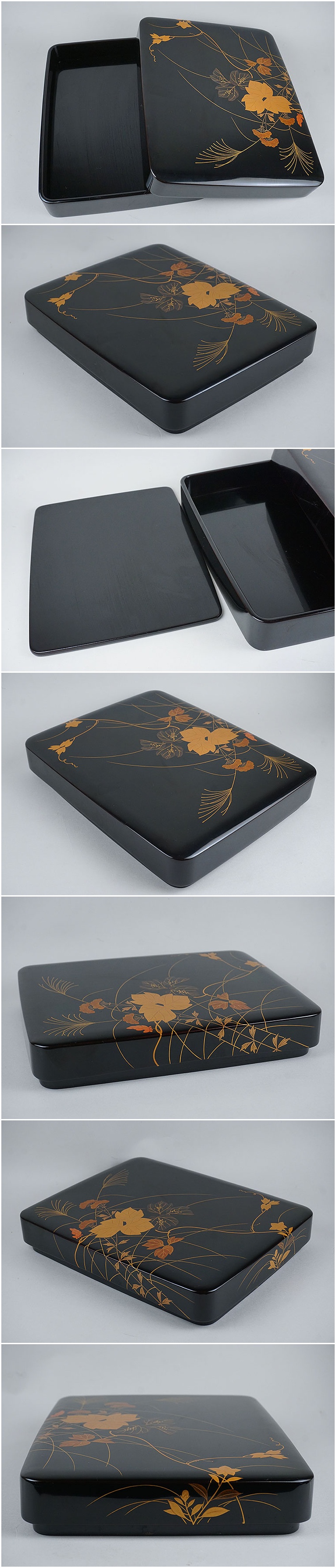 | D-363■古い輪島塗 硯箱 木彫漆器黒塗 金蒔絵秋草文 書道具文具道具 | ||