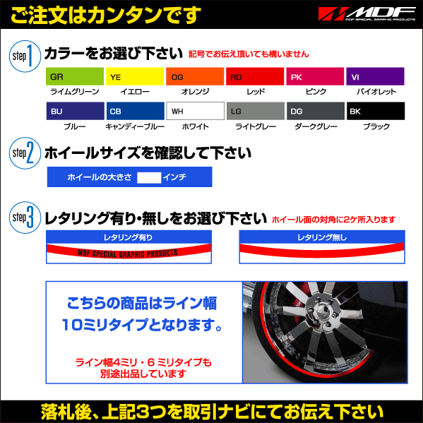 | 落札後に取引ナビでお届け先とご注文内容をご記入頂く案内をお送り致します。(土日祝日落札の場合は翌営業日のご連絡になります) ご希望のライン幅、カラー、前後ホイールサイズ、レタリングの有無をお知らせ頂きますので、あらかじめ画像2枚目を参照しご希望 内容を書き留めておいてください。 リムストライプゲージを同時に購入したい場合は、【 エムディーエフオフィシャル リムストライプゲージ 】で検索しそちらも落札して まとめて取引をご利用ください。 グラフィックキットなども同時に購入したい場合は、【 エムディーエフオフィシャル 】が出品している商品を落札頂きまとめて取引を ご利用ください。 まとめて取引の詳細はこちらをご覧ください。 |