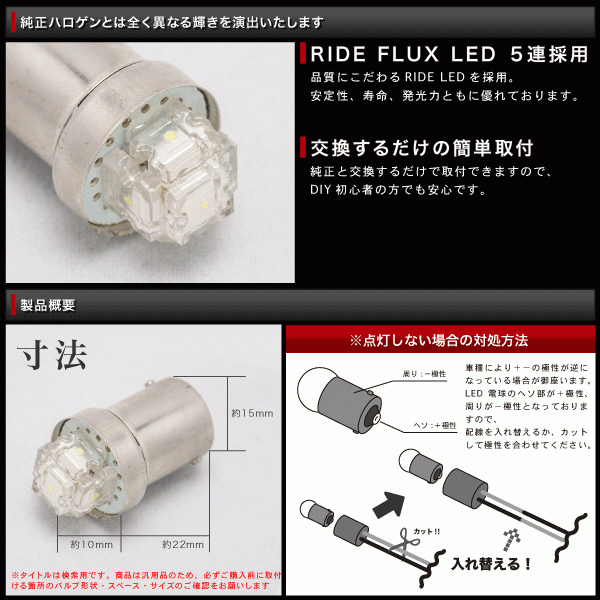 | ■FLUX LEDによる蒼白色の輝き! FLUXタイプのLEDを5連搭載!純正ランプとは全く異なる蒼白色の輝きは雰囲気を一変! ■驚きの長寿命、車に優しい省エネ! 約40000時間を超える長寿命、純正の1/10の省電力で車に優しい省エネ仕様! ■交換だけの簡単取り付け! 純正と入れ替えるだけの簡単取り付け! 【確認事項】 ※タイトルや適合は車種と適合の一部を掲載の為、必ずご購入前に現車でご確認下さい ※車検保証はできませんので純正球は必ず保管して下さい ※一部の車種は+-の電極が逆になる場合がある為、車側の配線を+-入れ替える必要があります |
