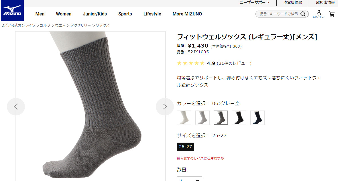 ミズノ [フィットウェルソックス レギュラー丈] 52JX100506 グレー杢 25-27cm 收藏