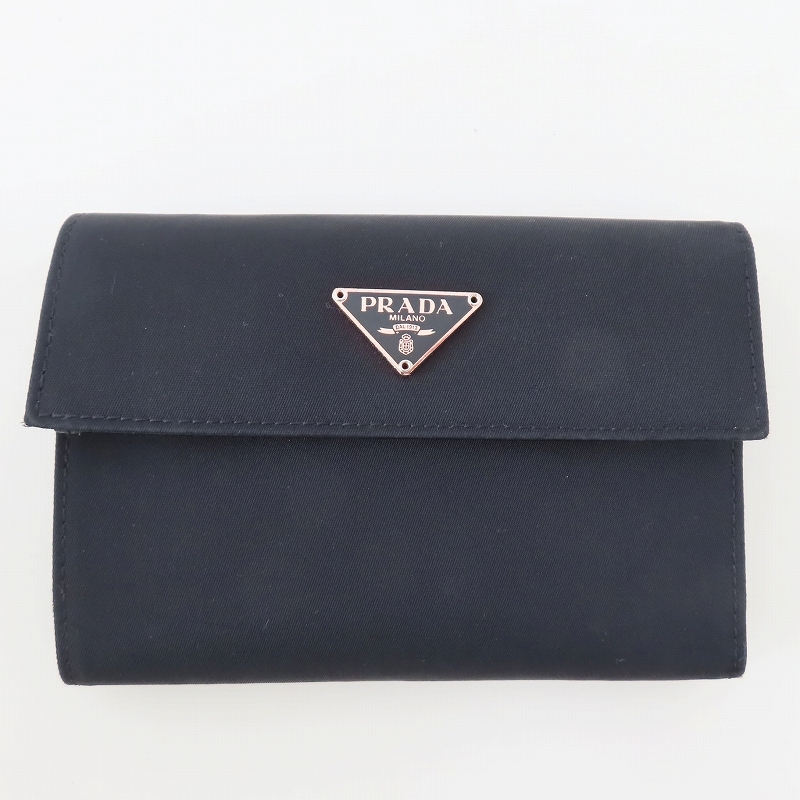 K09 PRADA プラダ ロゴプレート ナイロン/レザー 三つ折り財布 ブラック/ゴールド 1M0510 收藏