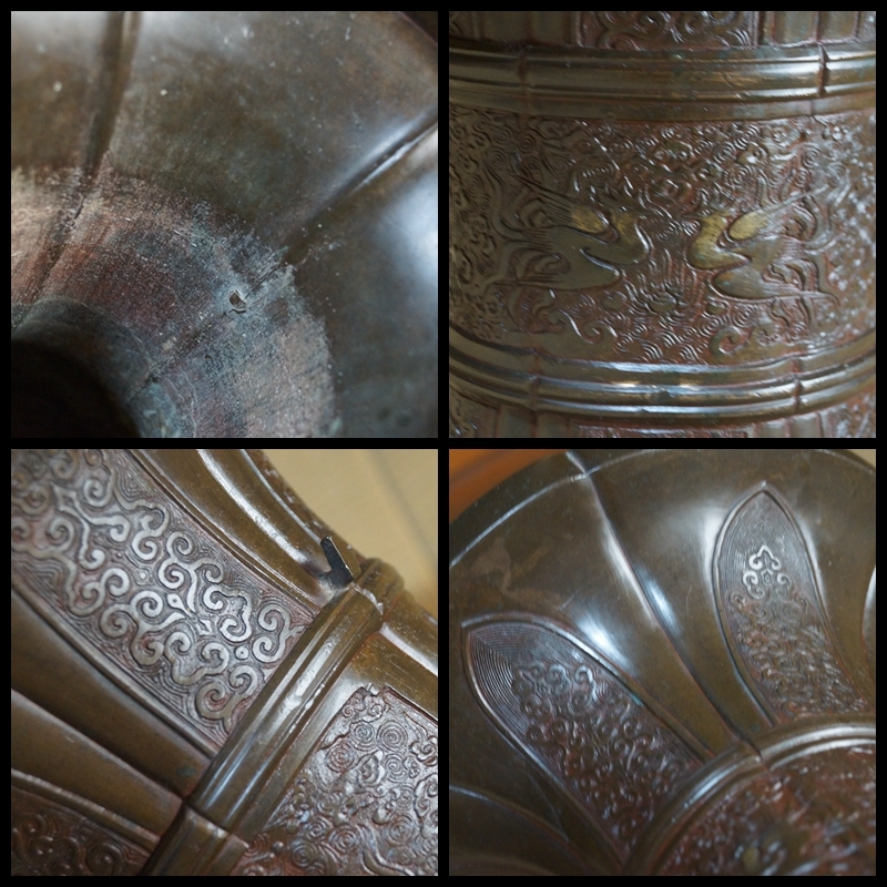 | 中国古美術 清 古銅大型陽刻『利鳳凰祥瑞文』 尊式花生花器 葵口双耳 唐物 古代寺院様式★希少品★ この清代の古銅大型陽刻尊式花生は、歴史と芸術が融合した逸品です。利鳳凰祥瑞文が精緻に刻まれ、古代中国の吉祥を象徴するデザインが際立っています。葵口双耳の優雅なフォルムは、格式ある寺院様式を彷彿とさせ、堂々たる存在感を放っています。 この大型銅器は、金工細工の技術が光り、細部に至るまで職人の卓越した技が感じられます。唐物としての価値も高く、歴史的背景を持つ装飾品として、コレクションやインテリアに最適です。寺院や格式ある空間に置けば、その荘厳な美しさが際立ち、時代を超えた魅力を楽しむことができます。 この逸品を手にすることで、清代の工芸美術の粋を感じることができるでしょう。歴史と芸術の融合を堪能しながら、その魅力を存分に味わってください。 サイズ(約): 高さ 27.5cm、幅 24.6cm 重さ5kg ※底に一部補強跡が見られます。 |