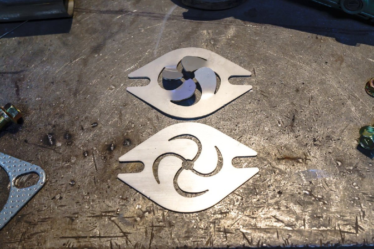 そのまま付けて静かすぎるという方は、中央のフィン部分を広げて調整してみてください(フィンを広げると音量が大きくなるがトルクが逃げていく)。手裏剣、ガスケットが2枚、ボルト・ナットが2つ付いたセットです。