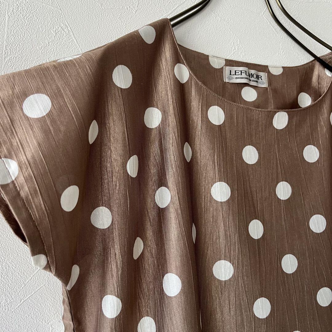 古着 日本製 ドット柄カットソー ドルマン フレンチスリーブ 水玉 レトロポップ M 茶色 ガーリー 大人かわいい しわ加工 ワッシャー生地 收藏