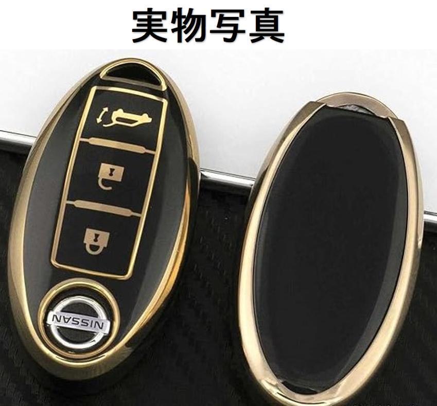 【送料無料、匿名配送】日産Nissan スマートキーケース TPU キーカバー バックドア ブラック×ゴールド 3ボタン 收藏