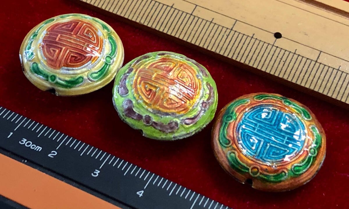 ¶!¶ 有線七宝焼ワールド - 3色(個)の円盤型玉で1単位 ¶!¶ 約厚9㎜×Φ23㎜ 金線3色釉緑褐色祥雲橙萬壽紋様 手作 手芸 工芸 インテリア 收藏