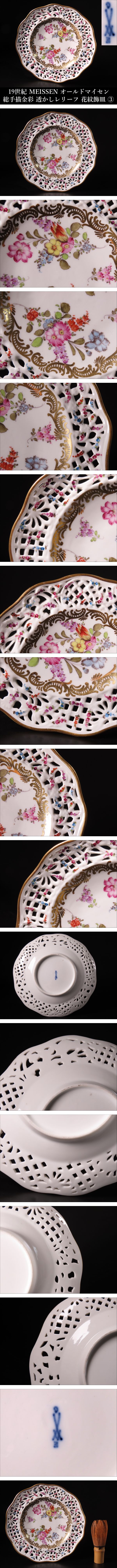 【ONE'S】19世紀 MEISSEN オールドマイセン 総手描金彩 透かしレリーフ フラワーブーケ文飾皿 オープンワーク プレート 径21cm 西洋美術 ③ | |||
