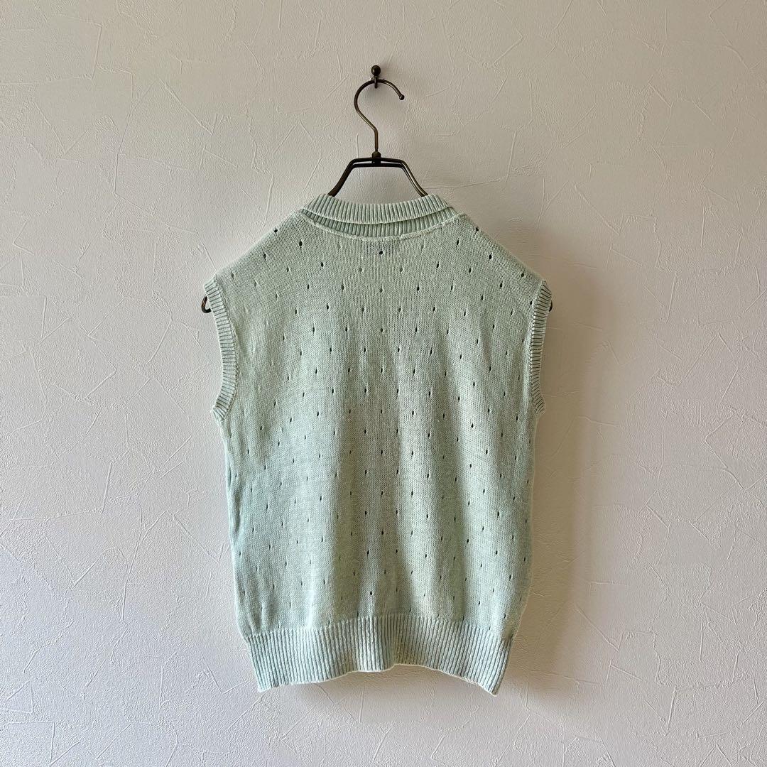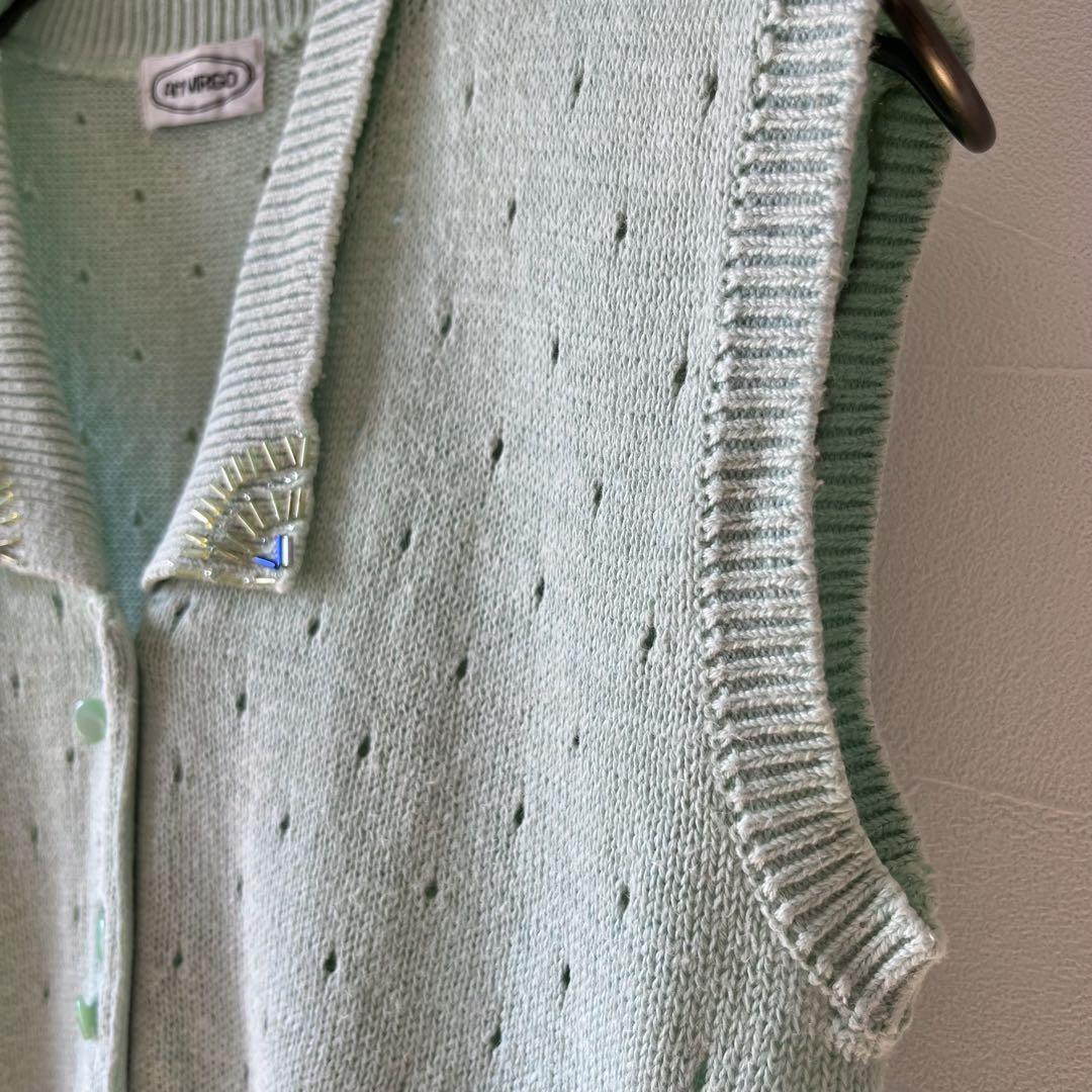 古着 日本製 ニットベスト 襟付 前開き ビーズ レトロ ミントグリーン リネン 麻 レイヤード レース編み 模様編み 大人かわいい 收藏