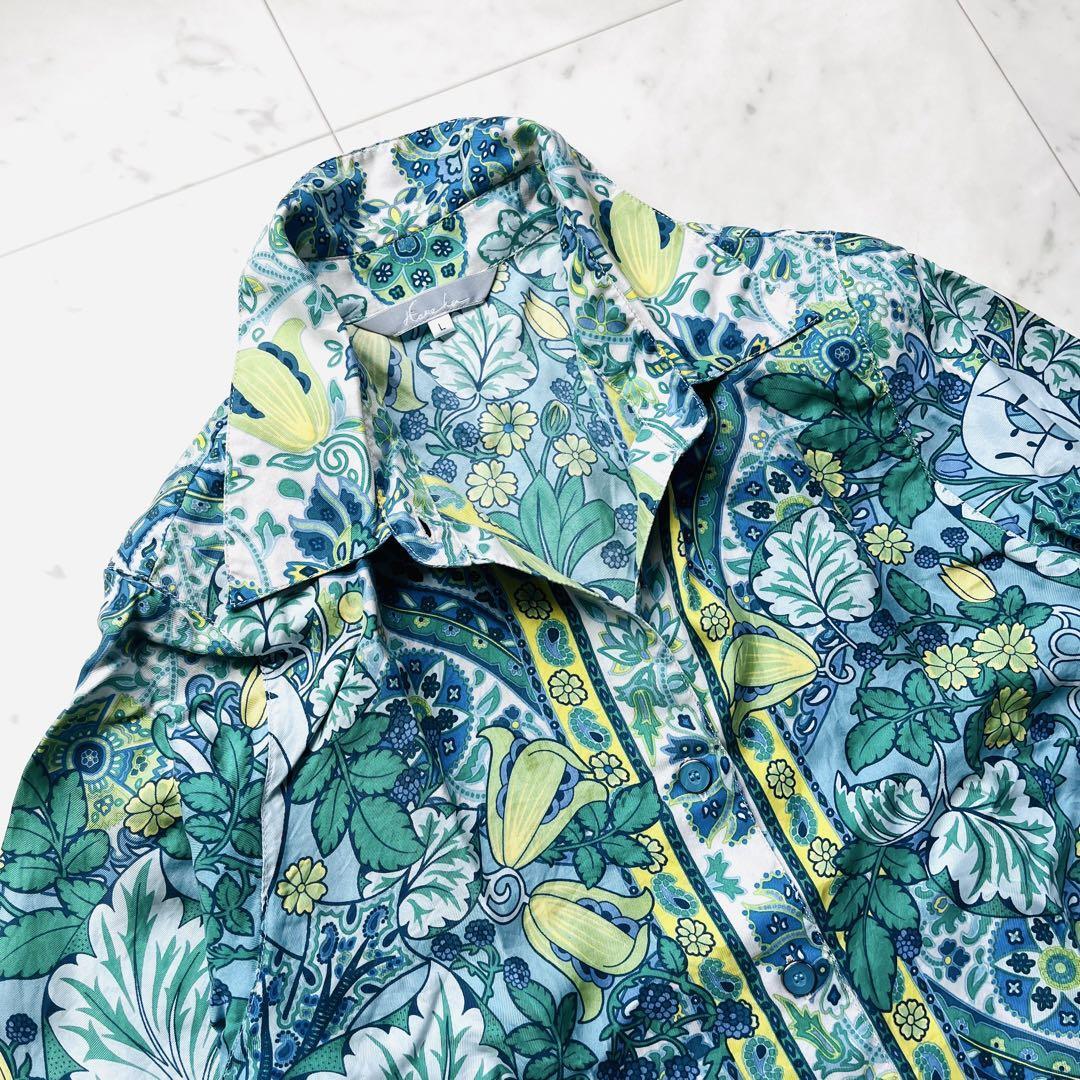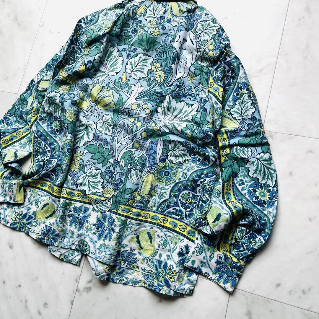 シルク100% シャツ ブラウス 長袖 絹 総柄 花柄 スカーフ柄 ヴィンテージ レトロ ブルー グリーン 青 緑 L 收藏