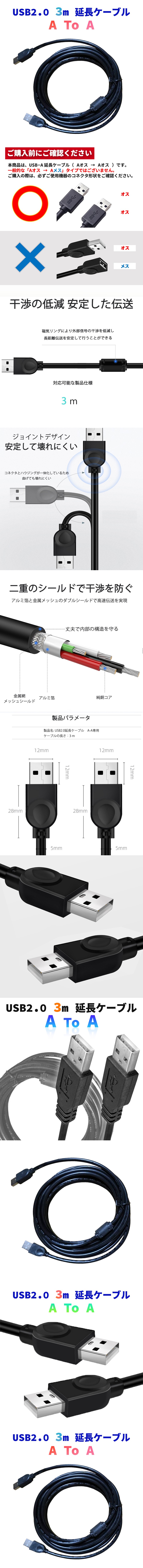 USB2.0 延長 USBケーブル 3m USBオスtoオス Type-A オス-オス 延長コード データ転送 充電 給電 PC 收藏