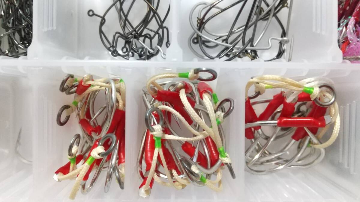 ・中断: オフセットフック(製品名不明)とアシストフック(右2つはメジャークラフト製が中心)