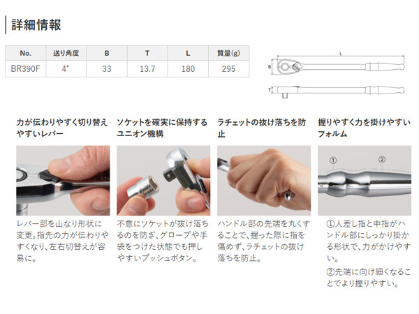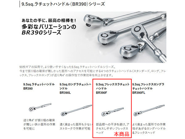 KTC 9.5sq フレックスラチェットハンドル BR390F 送り角4° 90枚ギア 空転トルク 7段クロウ 整備 工具 京都機械工具 メール便 送料無料 收藏