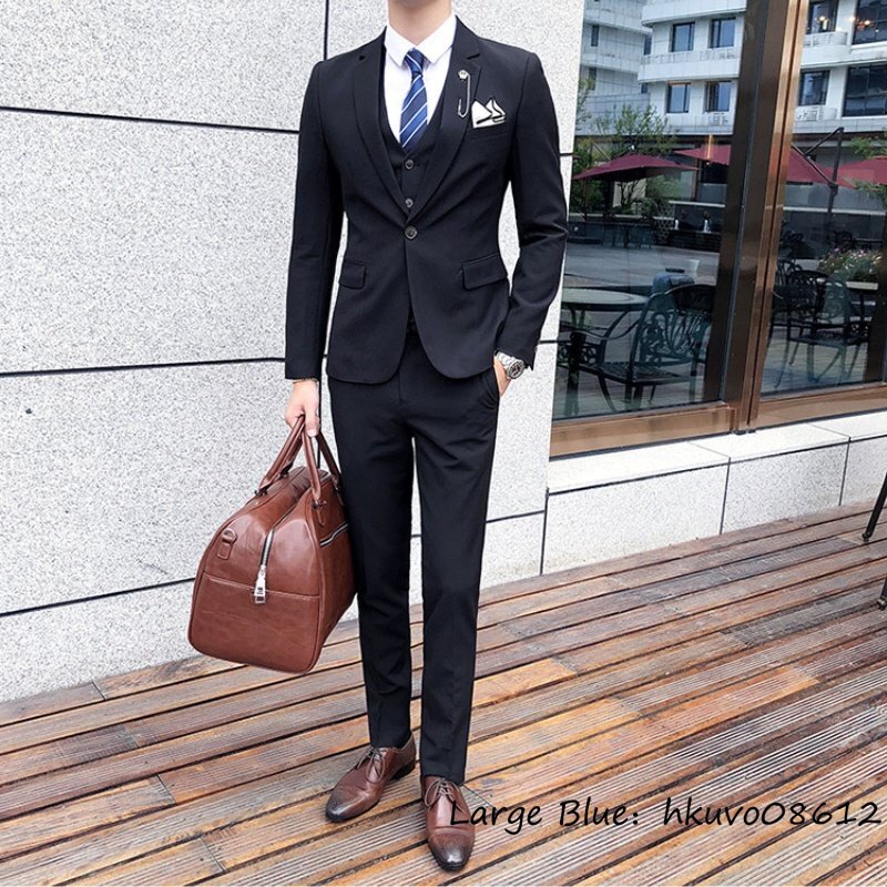 超希少■新品 スリーピース ビジネススーツ メンズ 三点セット 無地 一つボタン シングルスーツ 細身 スタイリッシュ 結婚式 ブラック L 收藏