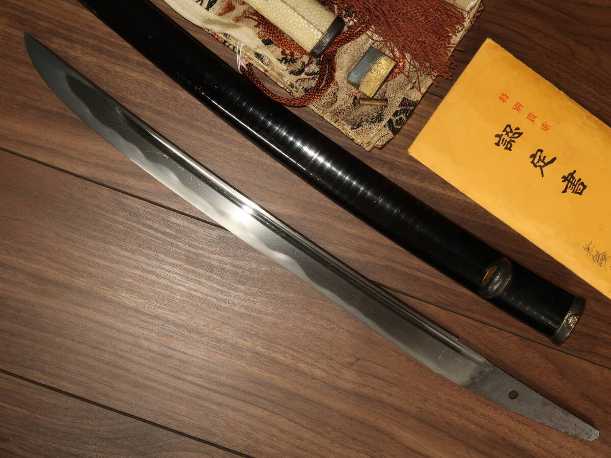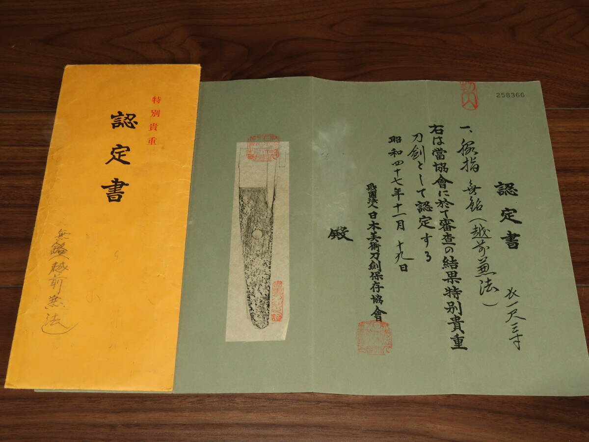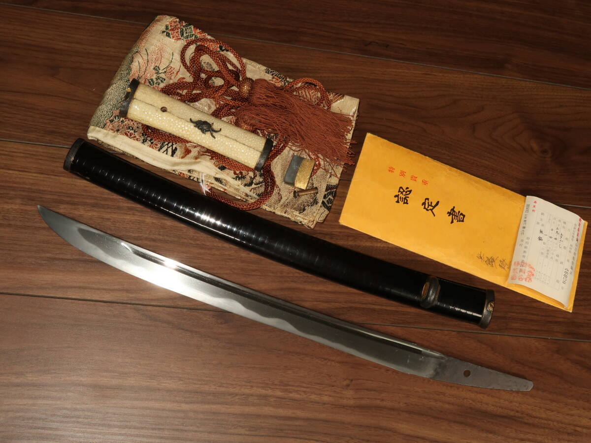 冠落し.棒樋入り.特別貴重認定書.越前兼法【無銘】合口拵入.赤銅地岩目地金具一作.小柄袋.小刀在銘.彫あり.鍛え.拵刀剣刀装具甲冑武具 收藏