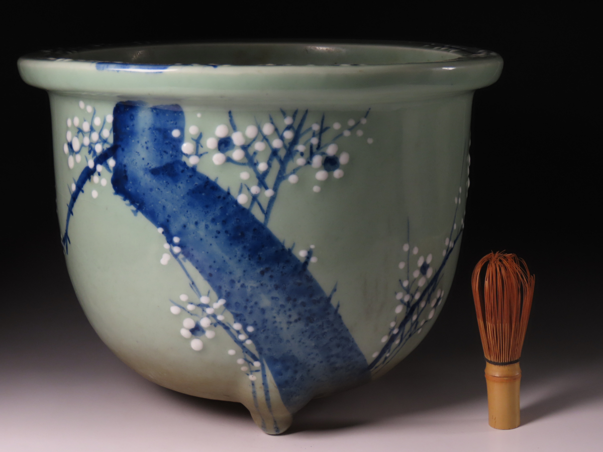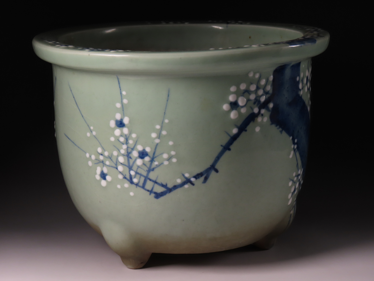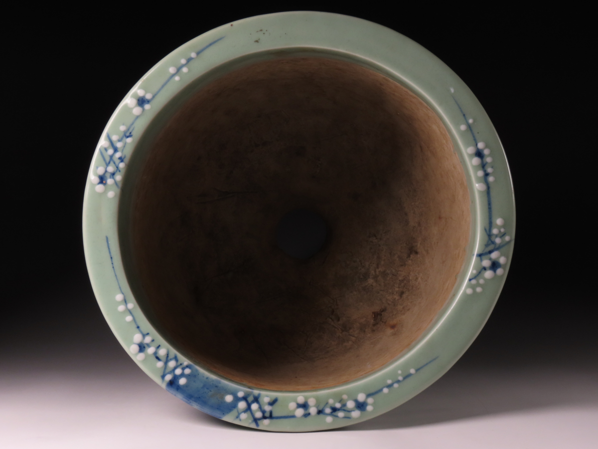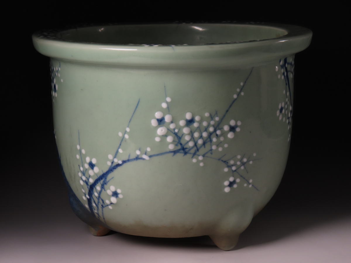 【ONE'S】古美術 時代本歌 瀬戸 尾張 最高峰作品 青磁梅花文三足丸鉢 径31cm 盆栽鉢 植木鉢 古美術品 | |||