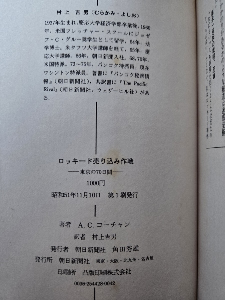 【初版】ロッキード売り込み作戦 東京の70日間 A.C.コーチャン 村上吉男 訳 朝日新聞社 昭和51年【管理番号ワ3cp本510】 收藏