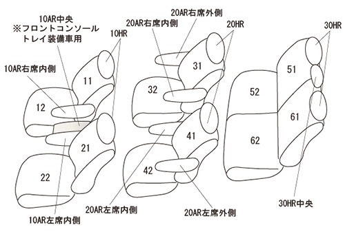 | 適合形状 | オプションのフロアイルミネーションを装備されている車に対応します。 ※2列目キャプテンシートシートに対応 快適温熱シート(シートヒーター)標準装備→対応 ※シートカバーを装着することで3列目シート跳ね上げ時、車体側にロックをかける際、シートを車体側に押すサポートが必要になります。 カバーは上記の作業に考慮して、最小限の厚みにしています。 ※コンソールボックスのフタ用にカバー(10AR中央)が付属していますが、シートカバーを装着することでフタを閉じてロックをかける際、フタを押し込む力が必要になります。 |