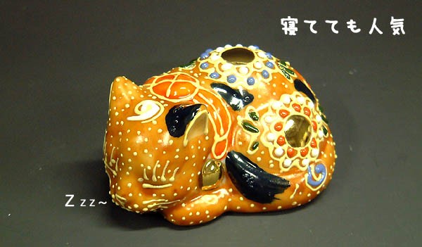 | ■作品紹介■ 【盛】(Mori) この作品には「盛」と呼ばれる手法が用いられております。デコ盛絵具を「一珍」という九谷独特の道具を使い、かなり立体的に模様が付けられています。手に持つとマッサージ効果ある?と思うくらい凸凹になっています。 ●おすすめポイント! 眠り猫の由来も様々ですが「安心して眠れる平和な世の中」といったような「平和」を意味している事が多いようです。ちっちゃくてとってもかわいい眠り猫、寝てても人気があるんです♪ご自宅の机の上などに置いてみては如何ですか?会社のデスクに置いたらみんなの人気者になるに違いない! | |