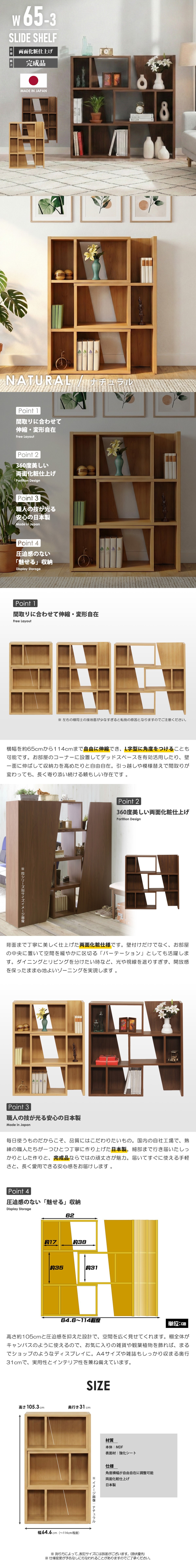 スライド シェルフ 3段 幅65cm 日本製 完成品 伸縮 コーナー ラック 本棚 オープンラック ナチュラル 收藏