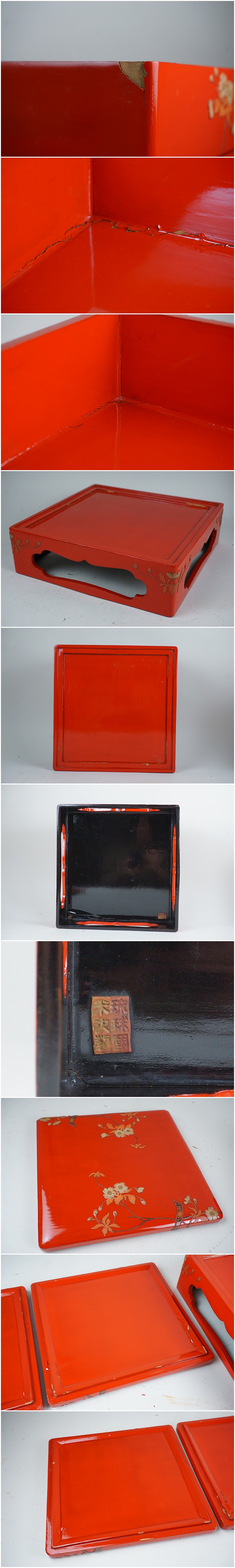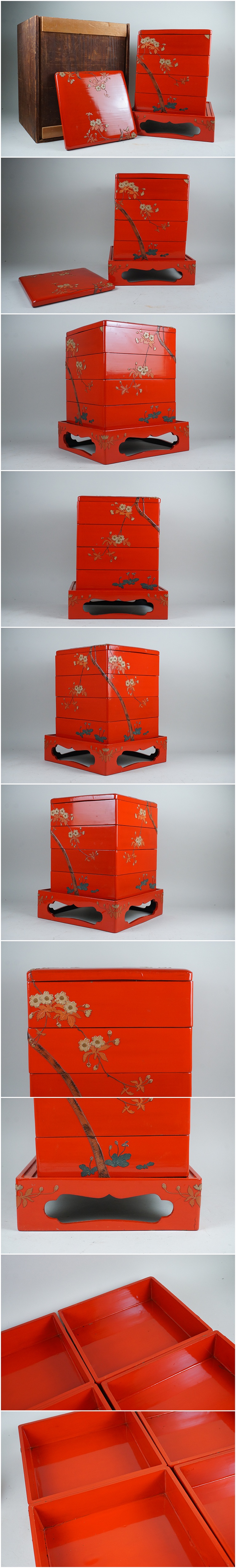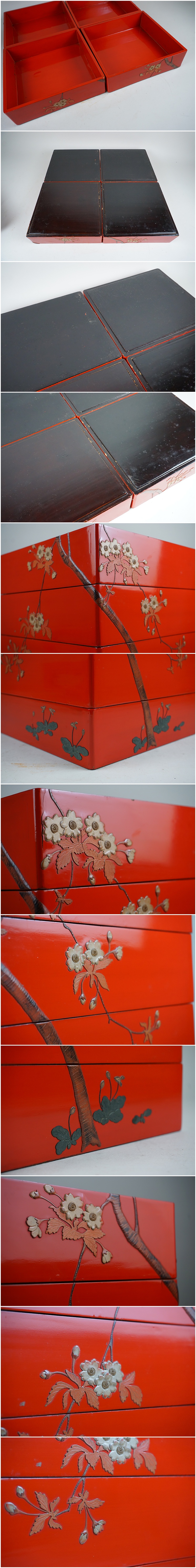 D-358■琉球塗り 桜堆錦 木製漆塗 時代塗 四段重箱 見返り蓋付き(二枚) 收藏