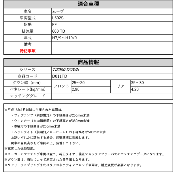 [RS-R_Ti2000 DOWN]L602S ムーヴ(2WD_660 TB_H7/9~H10/9)用車検対応ダウンサス[D011TD] 收藏