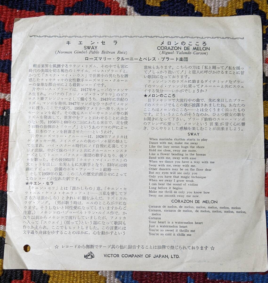 50s ローズマリー・クルーニーとペレス・プラード 楽団 (国内盤 7inch)/ キエン・セラ / メロンの心 Victor SS-1234 1960年 收藏