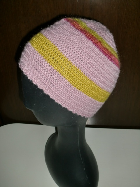 80代のおばーちゃんが自己流で編んだニット帽 ピンク 黄色&赤ライン 春秋冬用 薄手 ハンドメイド 收藏