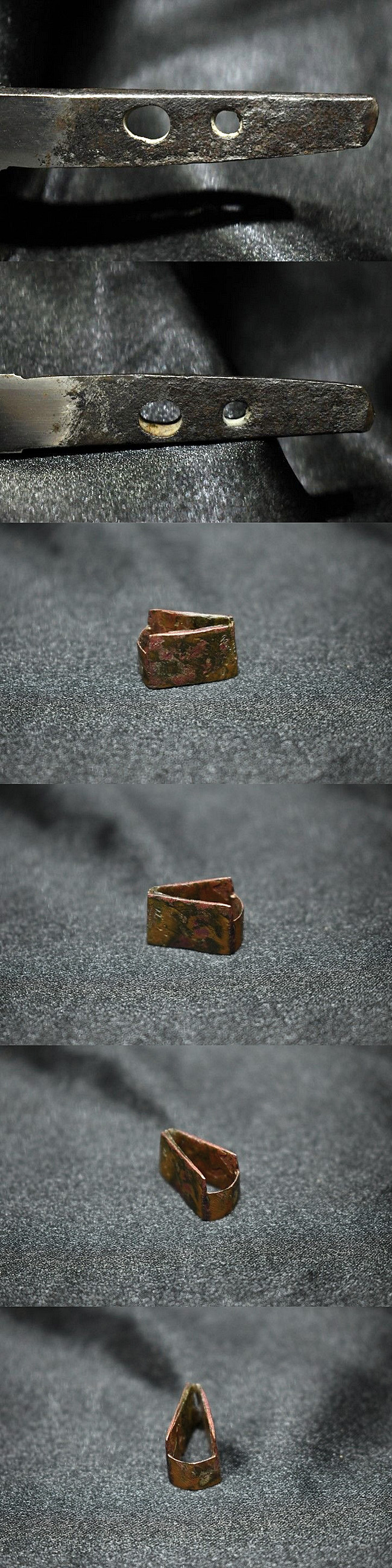 表【-】 裏【-】 種別:短刀 サイズ:長さ 16.8cm 反り: -cm 目くぎ穴 2個 元幅:約 1.596cm 元重:約 0.763cm 先幅:約 1.182cm 先重:約 0.582cm 刀身重量:約 83.6g(ハバキ・柄をとった状態) ハバキ重量:約 3.7g 鞘全長:約 29.2cm |