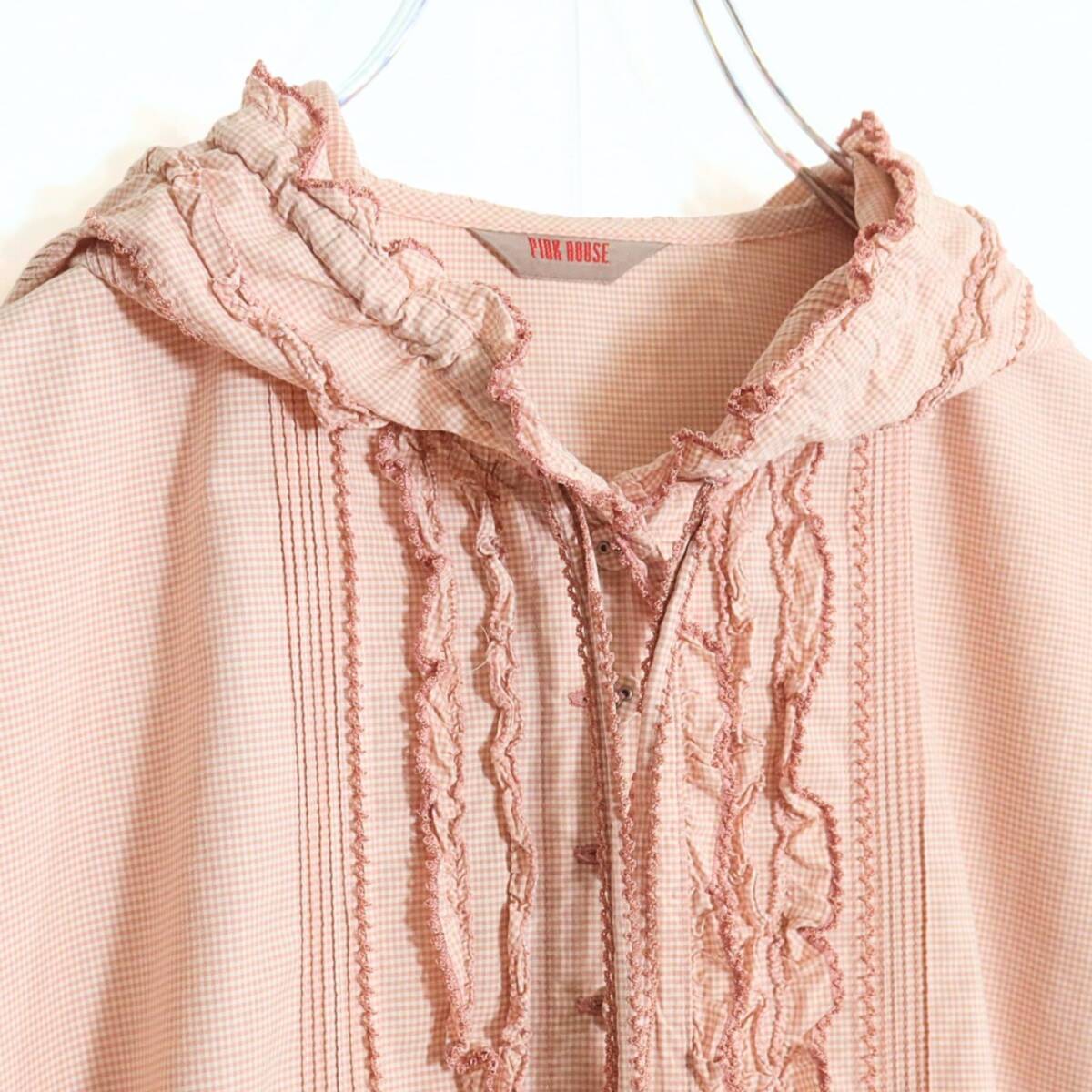 【美品】 ピンクハウス★ テディベア刺繍 ギンガムチェック フリル フード付きブラウス 長袖 オーバーブラウス ピンク系・z14504 收藏