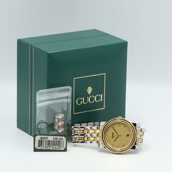 デッドストック級 稼働 新品同様 箱/コマ2付 グッチ QZ 4300M デイト ラウンド ゴールド文字盤 メンズ腕時計 9430ABC0886100STU 收藏