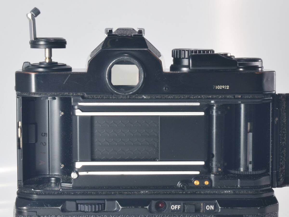 シャッター動作は概ね正常です。 露出計は通電しますが、「-」から変化しません。 ファインダー内はわずかなチリのみで、クリアです。 モータードライブは通電し、全速しっかり動作します。 |