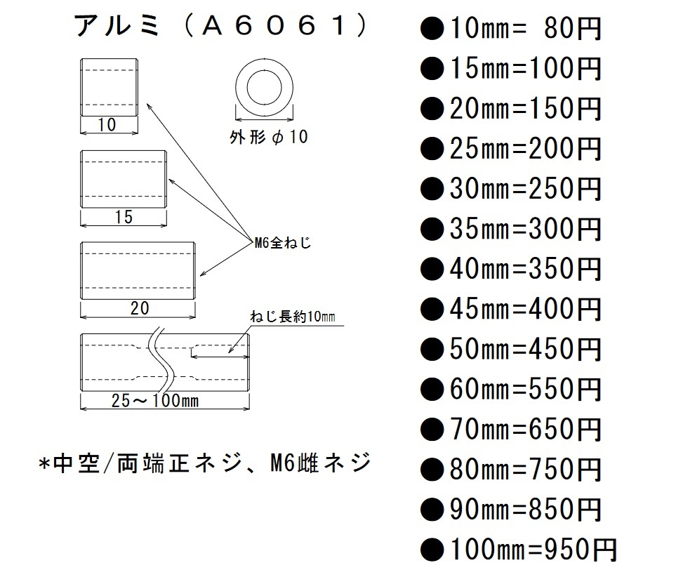 送料230円/140円 ネジ付き アルミ スペーサーM6(14種から選択) DIY/カスタムに 收藏