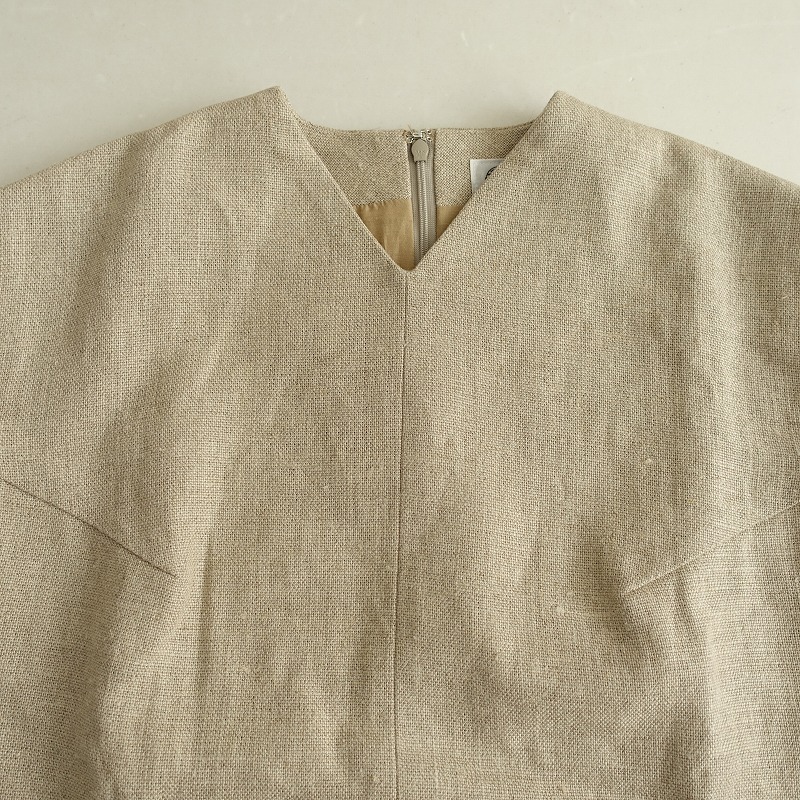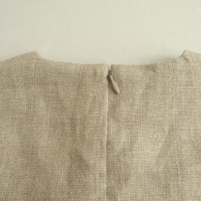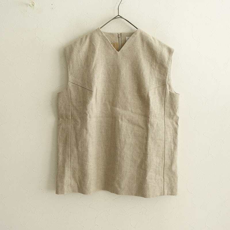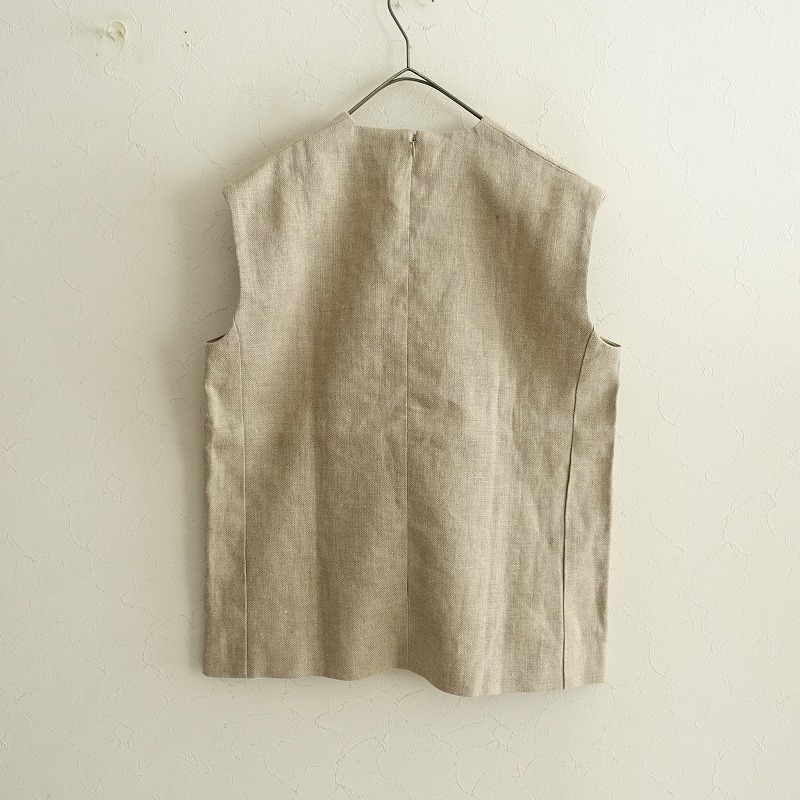 | R&D.M.Co-のリネンプルオーバーベストです。カラーはナチュラルベージュで、微起毛リネン地で仕立てられており、裏地が付いております。Vネックデザインで、バックファスナー半開で着脱できます。 |