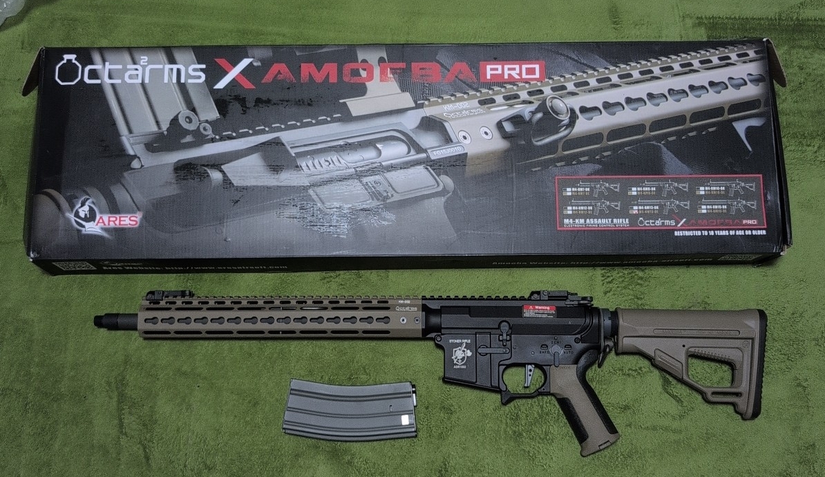 ARES 電動ガン AR-M4-KM13-DEです。こちら購入してから未開封だったみたいです。出品にあたり、動作確認、弾速測定が初火入れになりました。