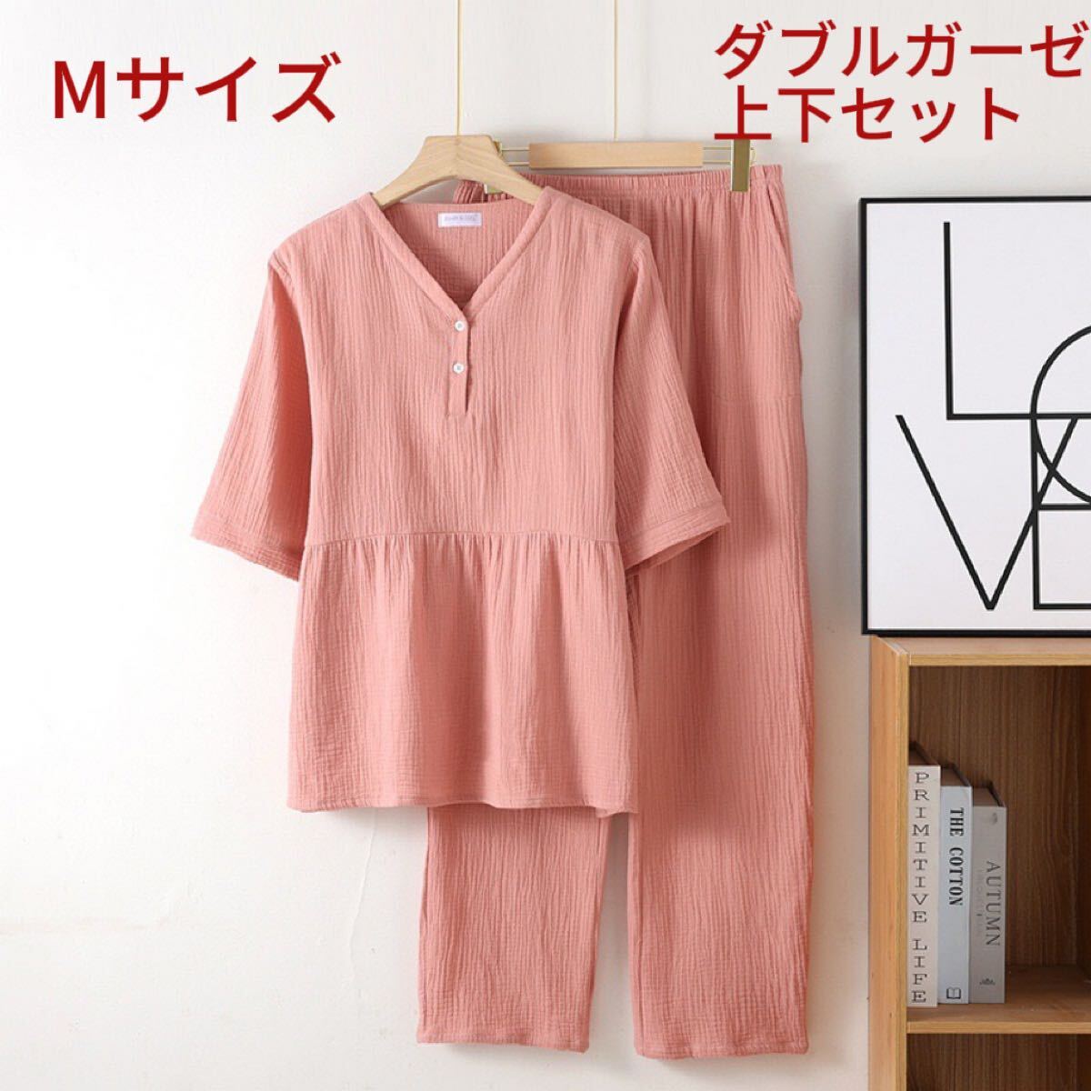 パジャマレディース M半袖長パンツ綿2重ガーゼ柔らかい透気夏暑さ対策入院入所ルームウェア婦人柔らか快眠vネック寝巻きピンク 收藏