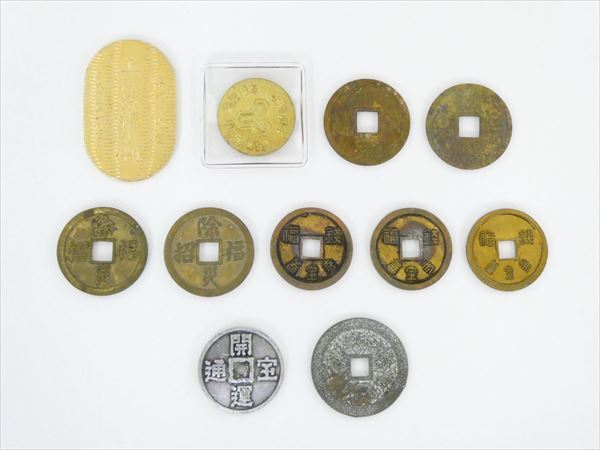 | ★商品★ ・福銭:11点 ★寸法★ <小判形> ・縦 (約)40mm ・横 (約)25mm ・厚さ (約)2mm <円形> ・直径 (約)22.5〜27mm ・厚さ (約)1.2〜3mm ★重量★ ・(約)1.6〜13.1g ★状態★ ・経年による傷、摩耗、汚れ、変色などが見られます。 ・比較的、綺麗なものも含まれます。 ※備考※ 商品状態に関しては、あくまでも当方の見立てとなります。 程度には個人差がございますので、商品画像を良くご覧になられた上でのご入札お待ちしております。 |