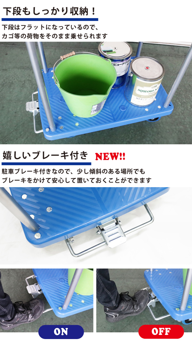 ブレーキ付きで安心! 軽量で移動もラクラク♪ ●2段式でスペースを有効に使え作業効率がUPします ●上段にはこぼれ落ちガードが付いているので、大事な物の脱落を防ぎます (ガードを取り外す事もできます) ●下段はフラットになっているので、カゴや荷物をたくさん乗せられます ●荷台表面はギザギザの滑り止め加工を施し、滑り止めのゴムが4か所付いています ●底面は樹脂製により水や錆に強く強度があります ●駐車ブレーキ付きなので、少し傾斜のある場所でもブレーキをかけて安心して置いておくことができます ●この商品はお客様組立てとなります ※本体の組立てやキャスター/ブレーキの取付けに工具が必要となります |