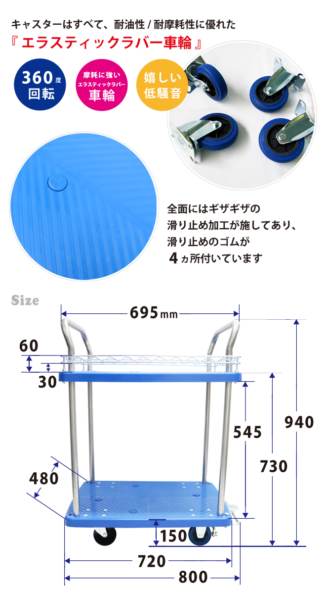 | 車輪 | ・エラスティックラバー車輪 (サイズ:100φ×21mm) ・固定車輪×2個、自在車輪×2個 |