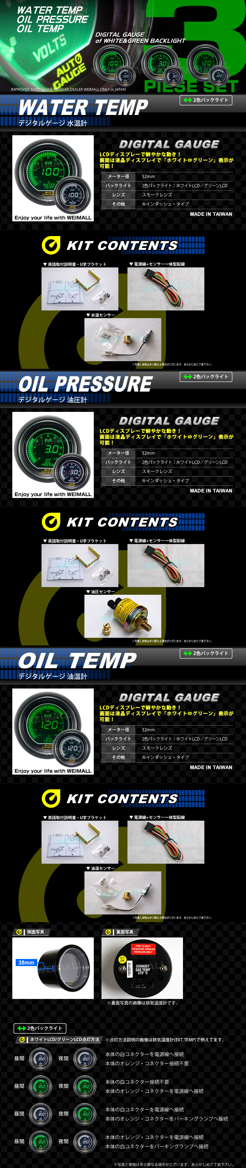 独占販売!デジタルゲージ オートゲージ 3点セット 水温/油温/油圧計 52mm グリーン/ホワイト パーツ一式付 autoguage 612WOO52 收藏