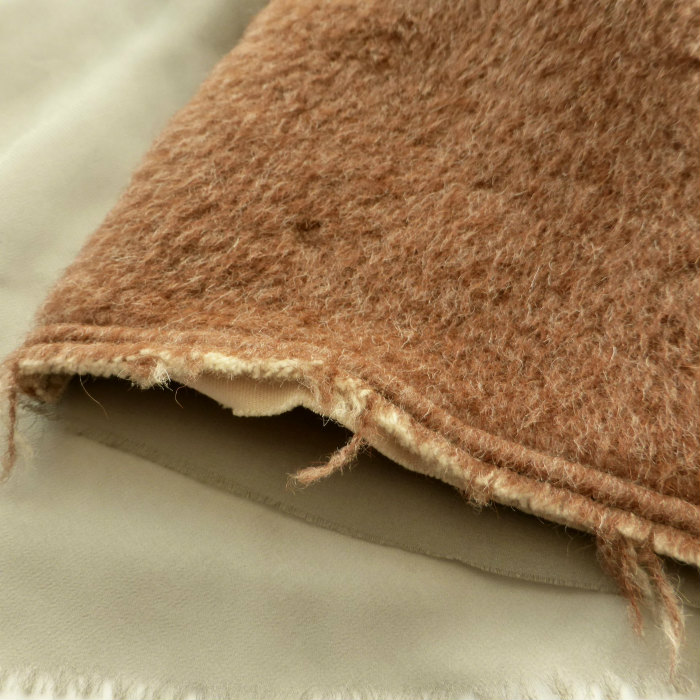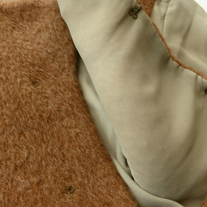 | 袖、裾に仕様による毛羽やほつれ、数か所シミ、襟元に汚れ、シャギー部分に毛抜けによるはげが見受けられますが、まだまだお使いいただけるお品です。 |