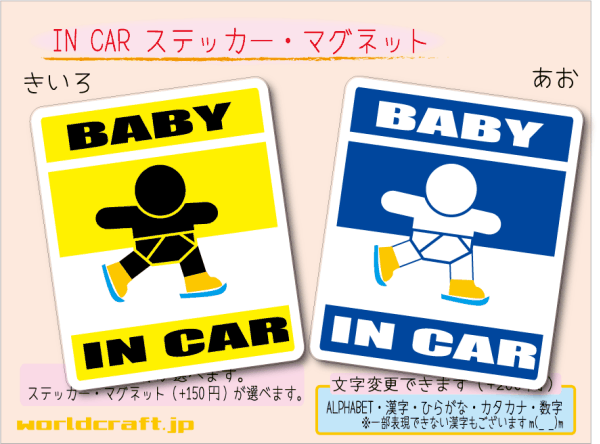 クルマのうしろにペタリとどうぞ!! ●サイズ : 縦 10.5cm × 横 9cm ●枚数 : 1枚 ■ 仕様選択 : ■ カラー選択 : 黄色 / 青 ☆仕様とカラー、それぞれどちらかひとつ お選びください☆ 画像1にはマグネット仕様+150円と書かれていますが、 このたびステッカーと同じ価格になりました☆ 現在マグネット仕様に追加料金はございません 落札後、取引ナビにて ご希望の仕様(ステッカー / マグネット)、ご希望カラー(黄色 / 青) をお知らせくださいませ ★ 耐久性UPしました ★ 耐水・耐候 屋外用塩ビシート仕様 ☆当店だけでしか買えないオリジナルデザイン☆ Made in JAPAN □ □ □ □ □ □ □ □ □ □ □ □ □ □ □ □ □ □ □ BABY IN CAR、BABY on BOARD、CHILD IN CAR、CHILD on BOARDバージョン、その他スノボバージョン、スケボーバージョン、野球バージョンなどなどいろんなバージョンいっぱい取りそろえております☆ ☆その他 出品中の○○ IN CAR ステッカーシリーズ☆ ・BABY IN CARステッカー ・CHILD IN CARステッカー ・○○ IN CARステッカー(大人バージョン) ☆もうひとつのオークションID i306st でも BABY CHILDステッカー出品中☆ BABY ・ CHILD ☆どうぞよろしくお願いいたします☆ ※お休みの連絡などある場合がございますので、ご入札前に必ず自己紹介欄をご覧くださいませ※