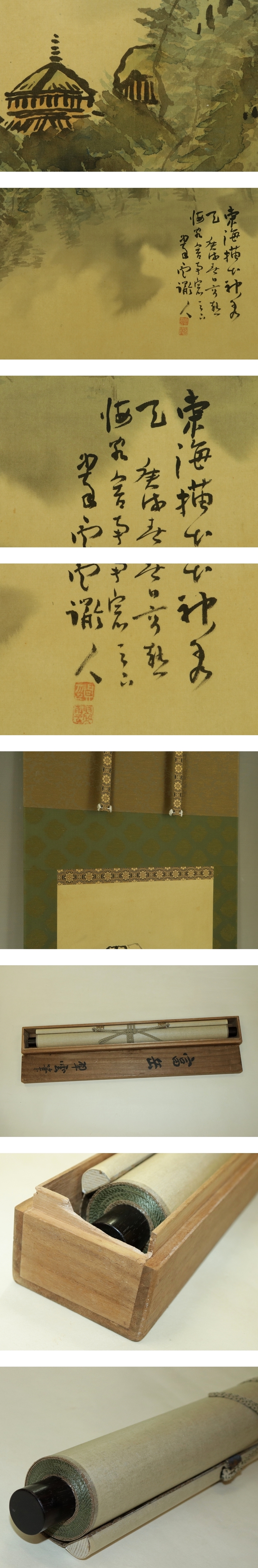 小室翠雲 こむろ-すいうん(1874-1945) 明治-昭和時代前期の日本画家。 明治7年8月31日生まれ。田崎草雲に学ぶ。 明治40年文展開設に際し、正派同志会を結成し文展新派に対抗。のち文展審査員。 大正10年矢野橋村らと日本南画院を設立。13年帝国美術院会員。昭和19年帝室技芸員。 昭和20年3月30日死去。72歳。群馬県出身。本名は貞次郎。代表作に「寒林幽居」。 本紙は、染み痕、ヤケ痕があります。 表装は、良好です。 【サイズ】 作品 横約40.5cm×縦約112cm 表装 横約55cm×縦約196cm |