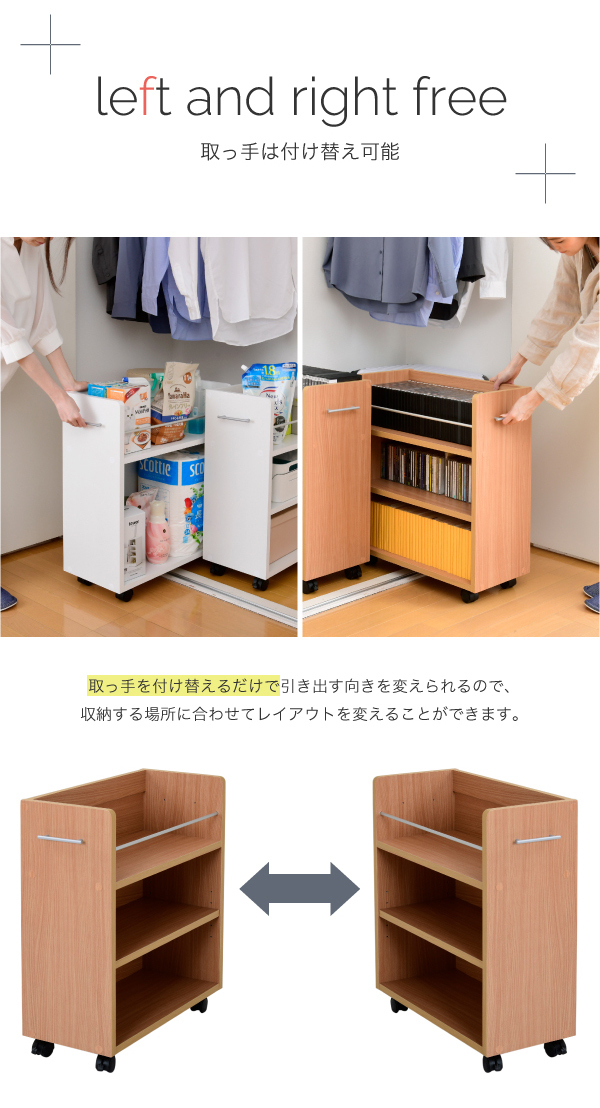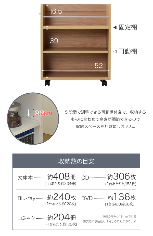 | 商品説明: | キャスター付きの便利なクローゼットラック2個組。 【商品仕様】 ■本体サイズ [外寸](1個あたり)約幅26.5×奥行58.5×高さ65.5cm ■その他サイズ [内寸] (オープン部)約幅24.5×奥行52×高さ39cm (上部オープン部)約幅22×奥行52×高さ16.5cm ■材質 [本体]プリント紙化粧合板 ■収納量 【1個あたり】 [文庫本]約204冊 [コミック]約102冊 [CD]約153枚 [DVD]約68枚 [Blu-ray]約120枚 ■耐荷重 [固定棚]約10kg [可動棚]約7kg ■備考 ・キャスター4個(うちストッパー付き2個) ・背面化粧有り ■生産国 インドネシア ■組立時間(目安)(大人2人) お客様組立(45分) ■キーワード 収納ラック 一人暮らし 省スペース 薄型 キャスター キャスター付 本 漫画 漫画本 マンガ CD DVD バッグ 箱 ランドセル 帽子 3段 木製 木 ホワイト 白 ナチュラル ダークブラウン シンプル |