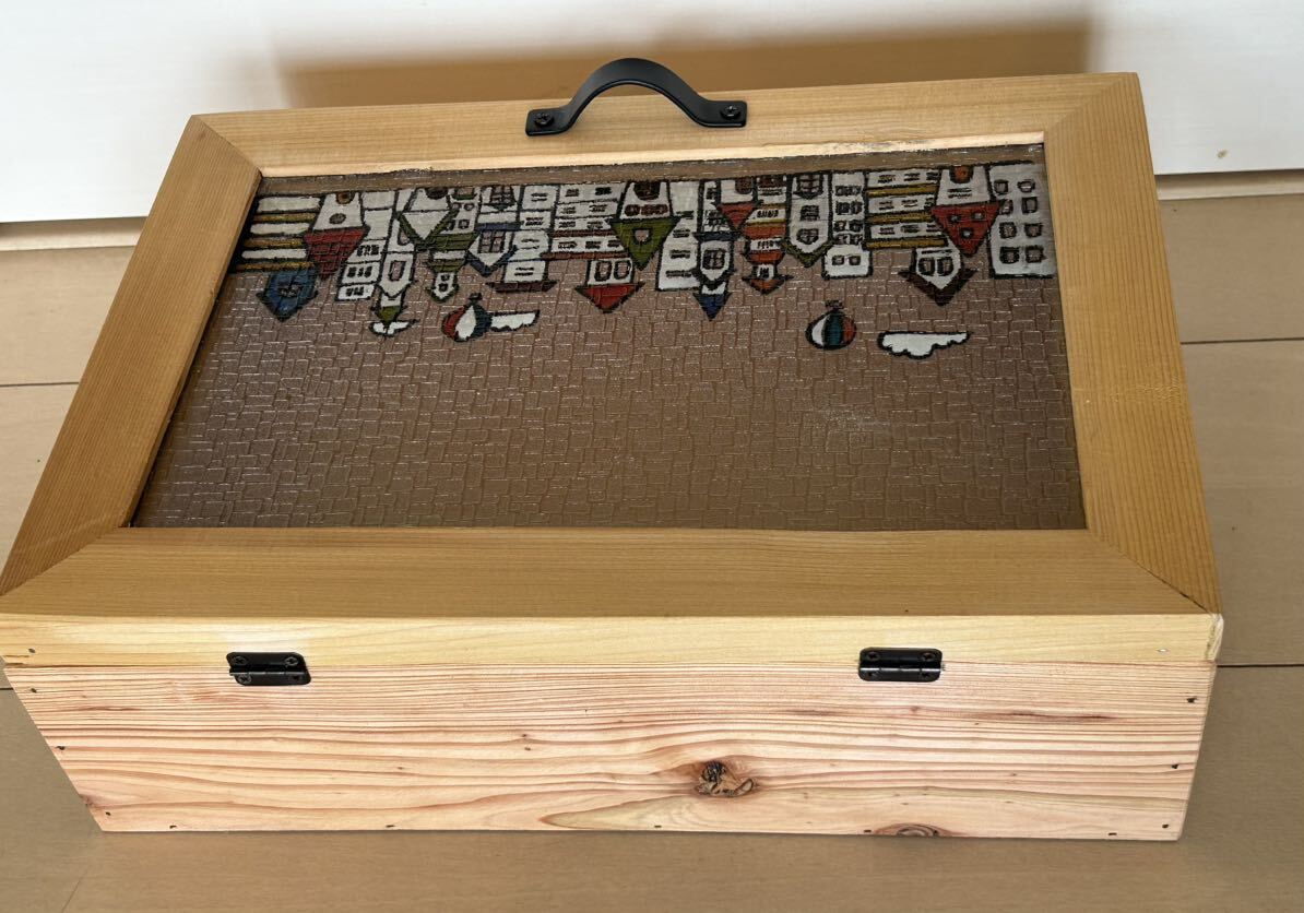 ビル群景色のガラス蓋のBOXです。 ダイヤ柄ガラスの蓋にビル群と空の絵で、表面をダイヤ柄ガラスにしていますので、光の当たり具合で、キラキラと輝きます。 前面上部にはフック金具が付いていて、 中のストッパー金具で、止まります。 大きさは、横幅34cm縦23.5 cm高さ11cmです。 小物入れにいかがですか? インテリアにもなります。 ハンドクラフト商品です。