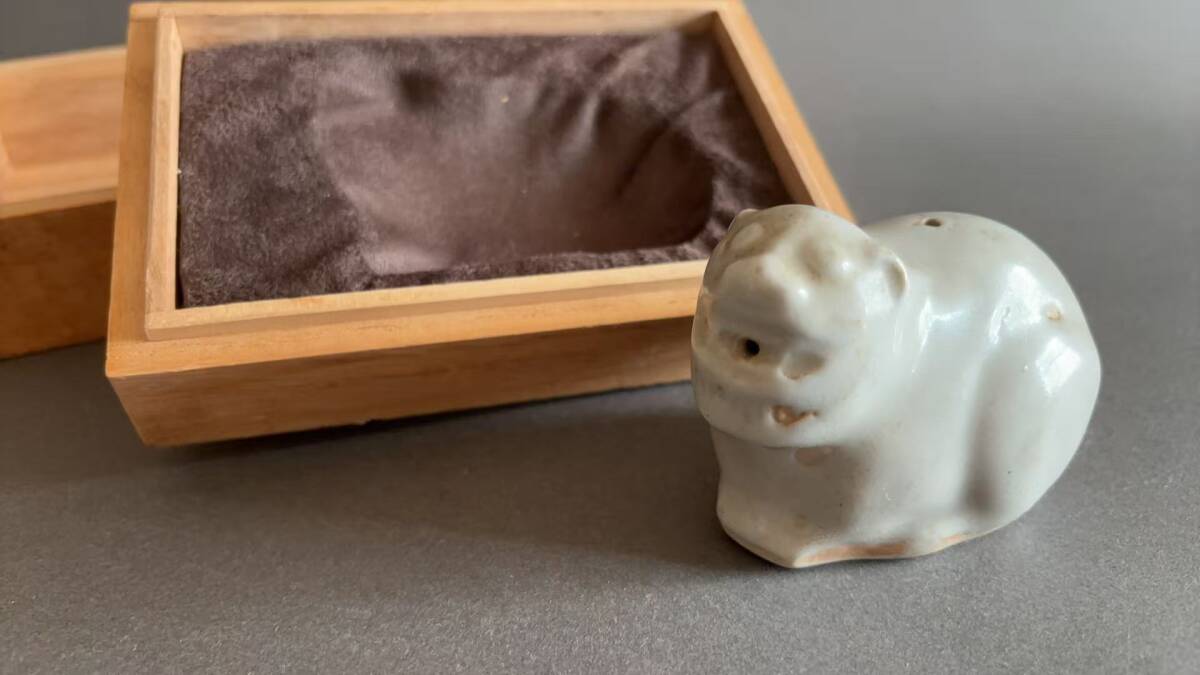 「水滴」とは、硯に水を注ぐ時に使う道具です。水滴に水を入れて上部にある穴を指で押さえ、角にある穴を下にして傾けても水は出ません。抑えている指をゆっくりゆるめると水が一滴づつ出ます。このように注ぎ口が小さな穴で水を一滴づつ出すことのできるものを「水滴」と呼び、大きな注ぎ口があるものを「水差し」と呼んでいます。