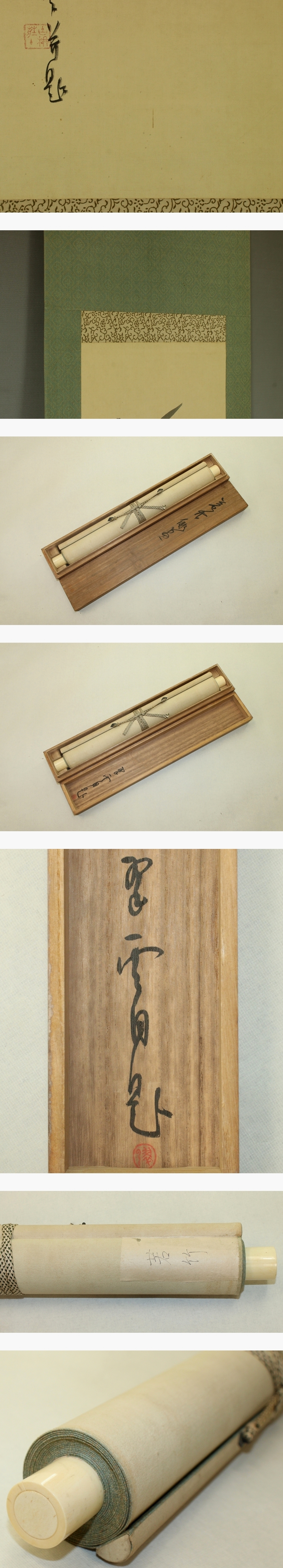 小室翠雲 こむろ-すいうん(1874-1945) 明治-昭和時代前期の日本画家。 明治7年8月31日生まれ。田崎草雲に学ぶ。 明治40年文展開設に際し、正派同志会を結成し文展新派に対抗。のち文展審査員。 大正10年矢野橋村らと日本南画院を設立。13年帝国美術院会員。昭和19年帝室技芸員。 昭和20年3月30日死去。72歳。群馬県出身。本名は貞次郎。 本紙は、染み、軽い汚れ、ヤケがあります。 表装は、染み、汚れ、軸先にヒビがあります。 【サイズ】 作品 横約27cm×縦約129.5cm 表装 横約39cm×縦約202cm |