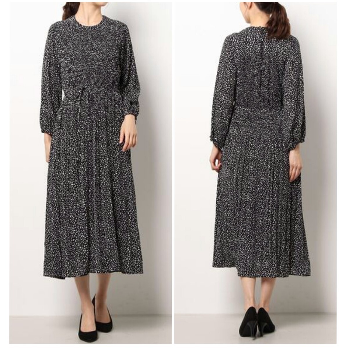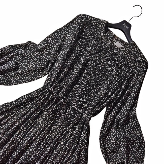 76 【ACUTA】 アクータ 総柄 プリーツ ロングワンピース ブラック レオパード ヒョウ柄 フレア Aライン ベルト ゆったり オーバーサイズ 收藏