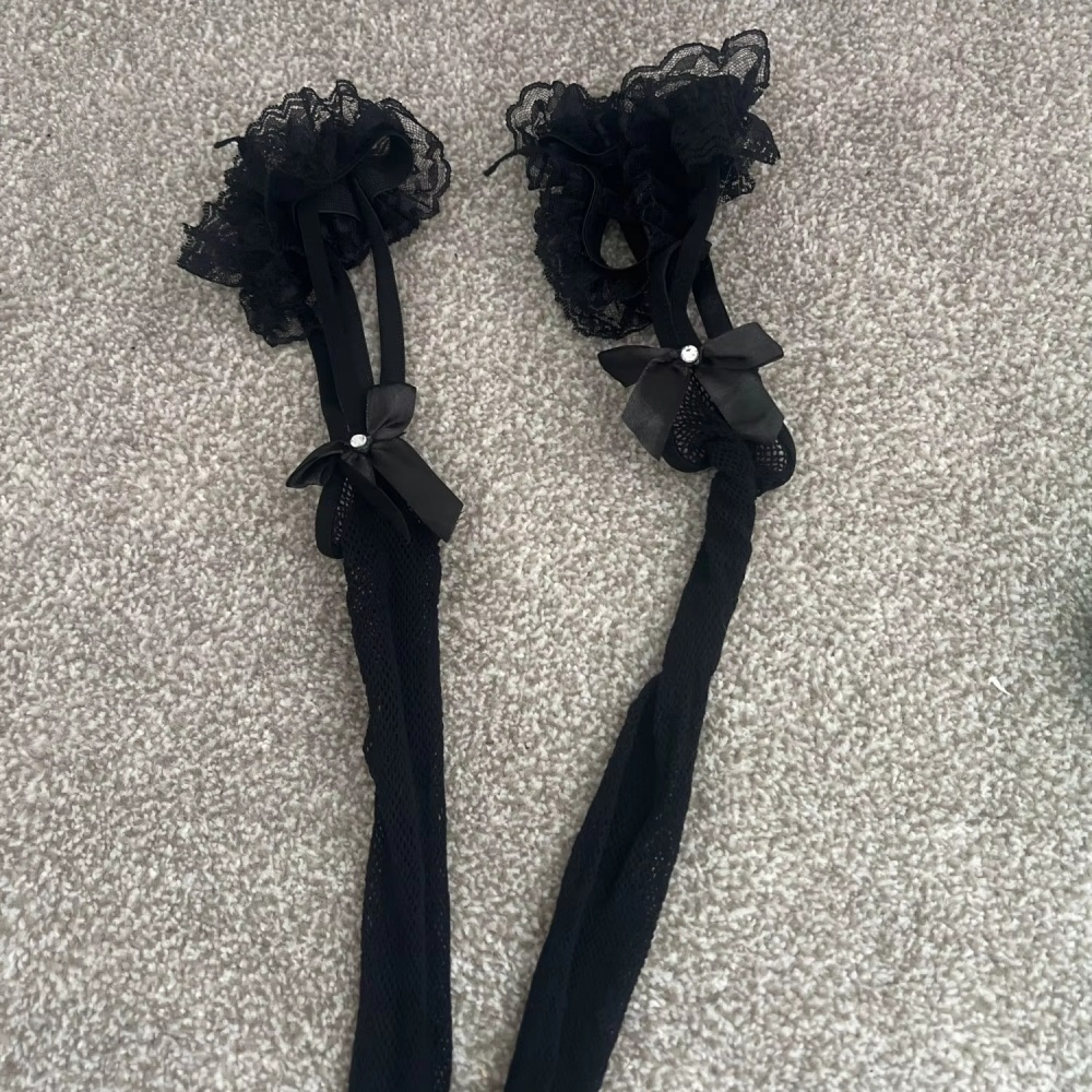 黒 ニーハイ ストッキング 網タイツ レース リボン ストッパー ガーター コスプレ ロリータ ゴスロリ メイド ネット 透け オーバーニー 收藏