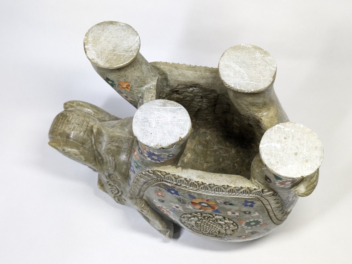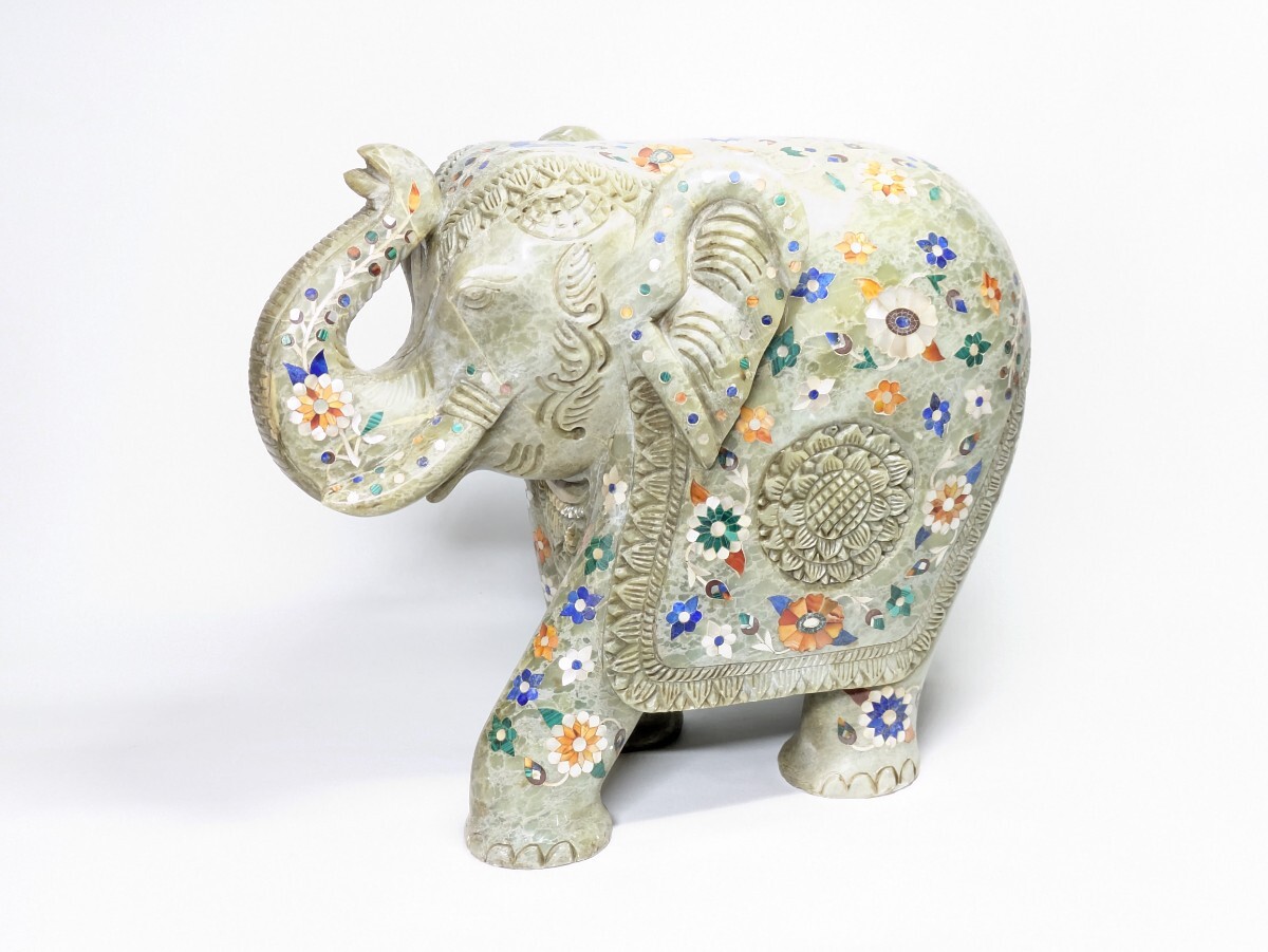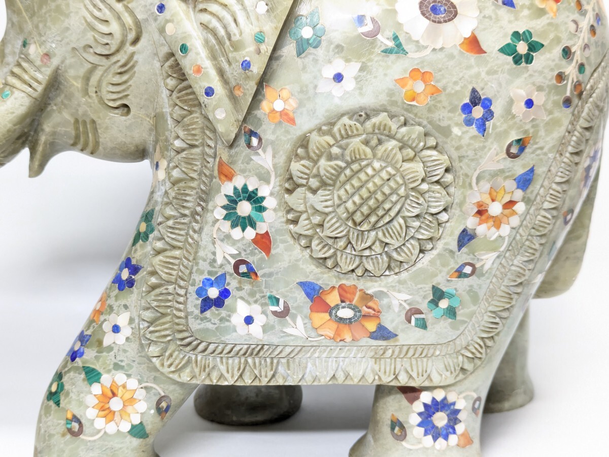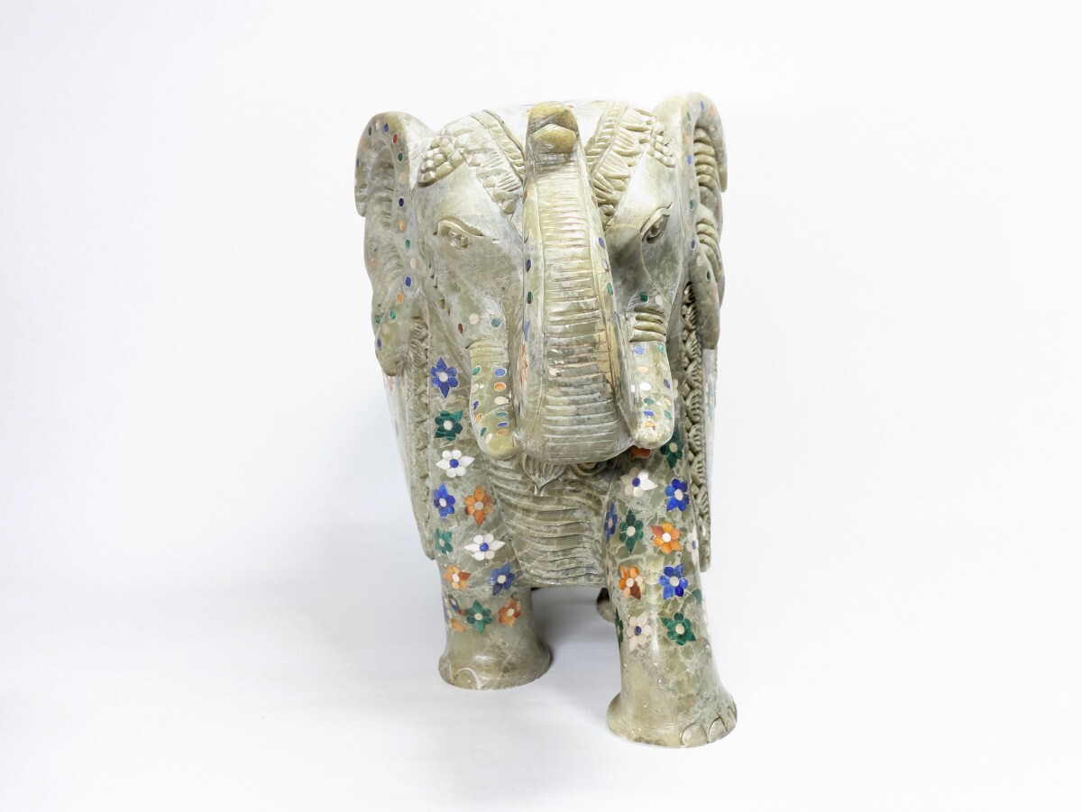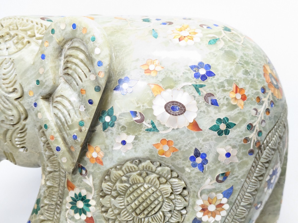 玉石彫 半貴石 螺鈿 象嵌 象 置物 高さ約24cm / 大型 大形 大作 天然石 石製 インド 中国 東洋彫刻 收藏
