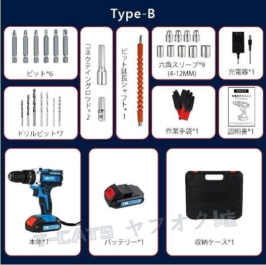 ビット*6、六角スリーブ*9* (4-12mm)、ドリルビット*7、フレキシブルシャフト*1、コネクテイングロツド*2、21V 1.5Ah バツテリー 1個 、ACアダプタ、収納ケース、日本語取扱説明書。家具の組み立てや、DIYの強い味方!